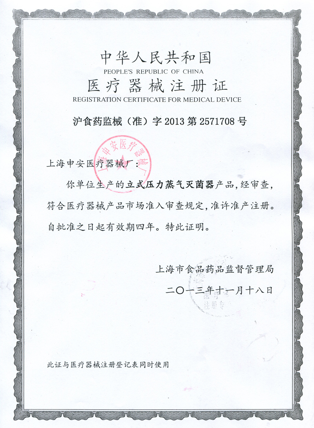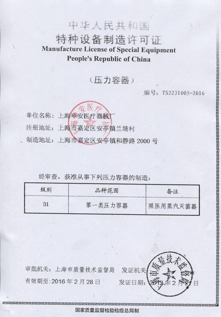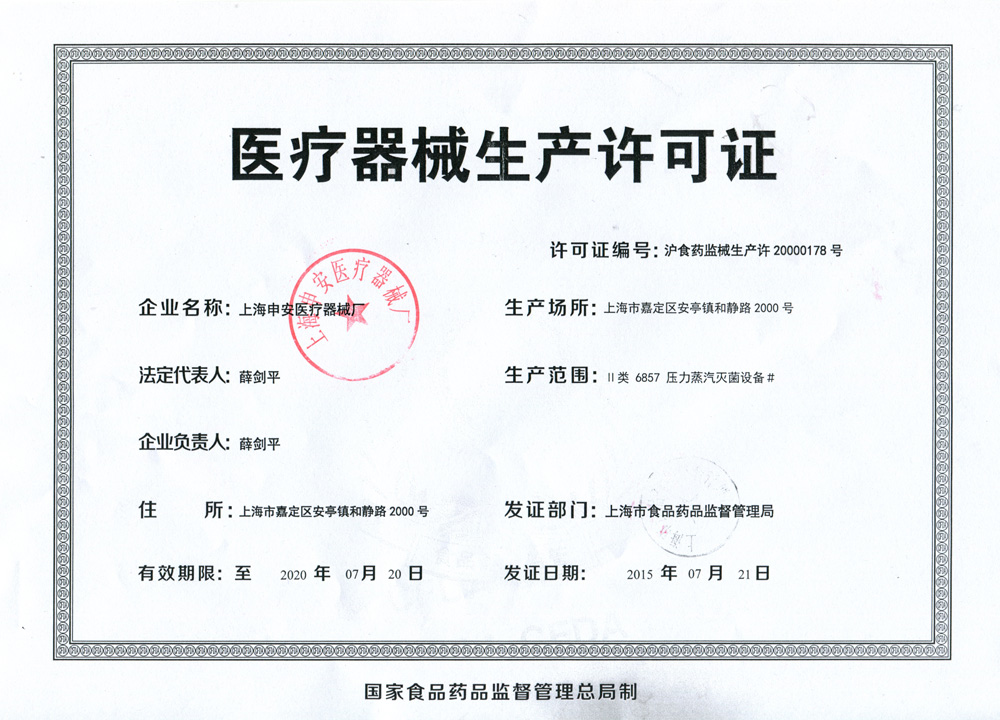 - 醫療器械生產許可證【滬食藥監械生產許20000178號】