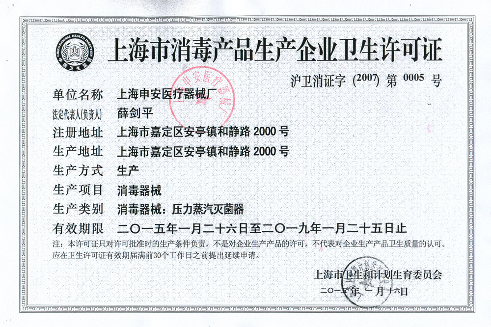 - 上海市消毒產品生產企業衛生許可證【滬衛消證字(2007)第0005號】
